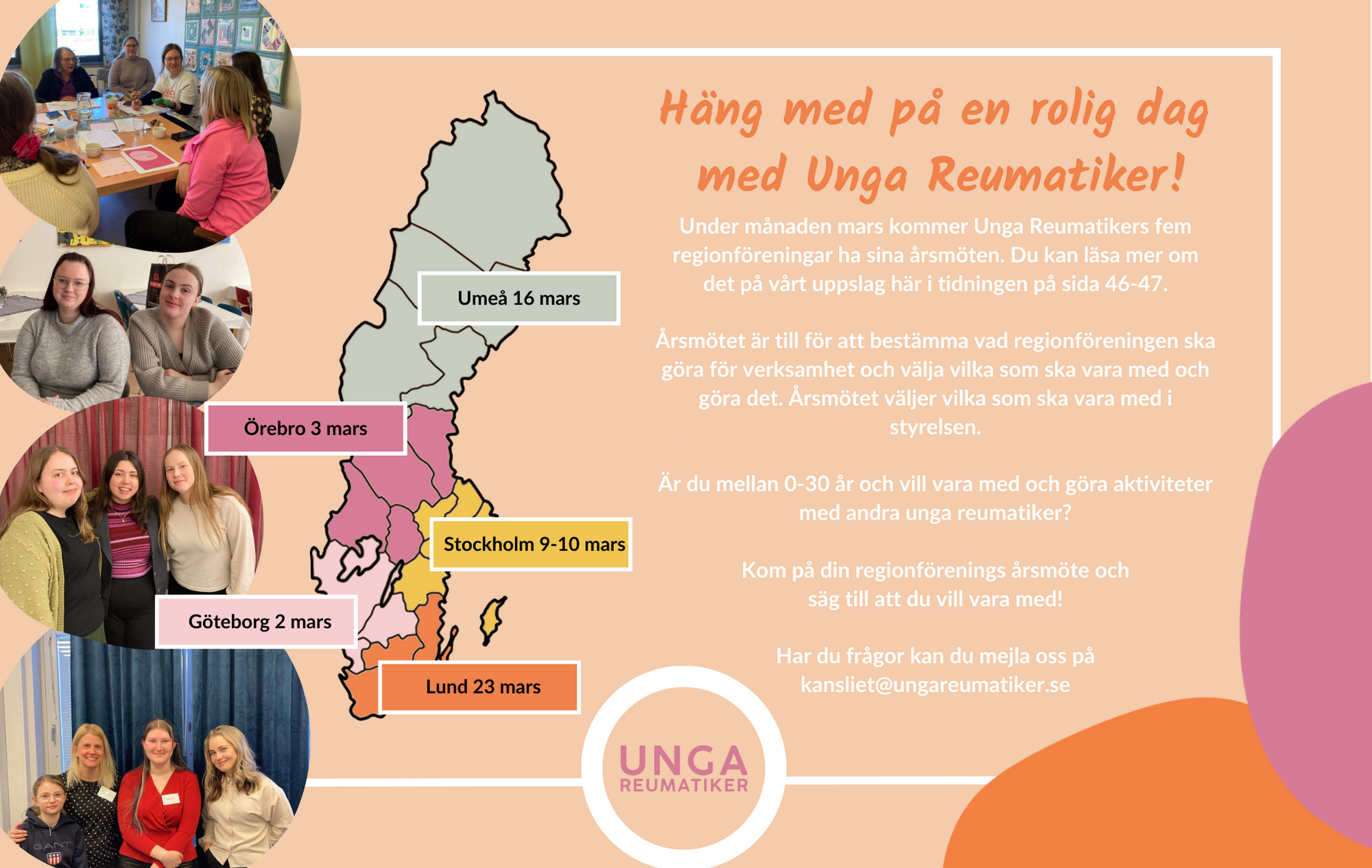 I mars är det årsmöten i Unga Reumatikers fem regionföreningar. På ett årsmöte berättar styrelsen om vad som gjorts under förra året, vilka aktiviteter som genomförts och hur regionens pengar använts. Under årsmötet presenterar styrelsen också sina förslag på budget samt vilka aktiviteter som planeras genomföras under nästa år. På årsmötet väljs också styrelsen för det kommande året, styrelsen är med och planerar och genomför aktiviteter för andra unga reumatiker, så är du intresserad av att vara med, hör av dig till styrelsen i din region!